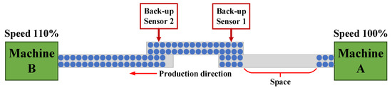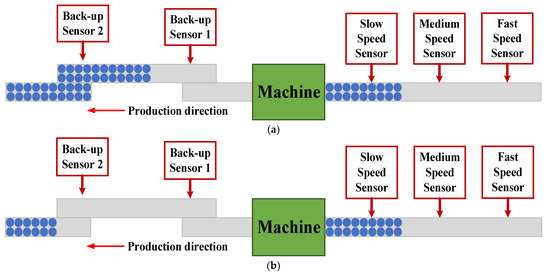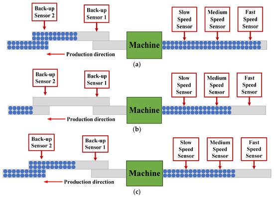 Speed sensors are used with the labeller and variopac machines to adjust the machine’s production speed based on three levels: fast, medium, and slow. The palletizer machine uses a supply sensor, which has the same function as the speed sensor, i.e., to inspect the bottle packs that flow along the conveyor. For the production speed control, the signals from all five sensors are employed, as shown in Table 2. The machine will automatically start when the backup sensor 1 status is ‘ON’ and the slow speed sensor status is ‘OFF’. The status of both sensors confirms that the system has raw materials to feed the machine and the conveyor space behind the machine is sufficient to support the resulting product. If the operator wants the machine to run at high speed, the system must ensure sufficient raw materials and space behind the machine. The raw materials must be as many as the fast speed sensor, and the backup sensor 2 has an ‘ON’ status, as displayed in Figure 5. The production speed will decrease to a medium speed if the conveyor is full, thereby causing the backup sensor 2 status to reflect an ‘OFF’ status or the fast speed sensor an ‘ON’ status, as indicated in Figure 6. If the fast and medium speed sensor has an ‘ON’ status, the production speed will be operated at a slow speed, as demonstrated in Figure 7. Finally, if both backup sensors have an ‘OFF’ status, the machine will stop receiving raw materials while also continuously working to clear the remaining raw materials from the machine, and subsequently, halts operation. After the machine has stopped working and solved the problems in the system, the machine can restart when the machine in the next step is run to reduce the product volume in the conveyor until the backup sensor 2 reflects an ‘ON’ status. Thus, the machine can restart operations.