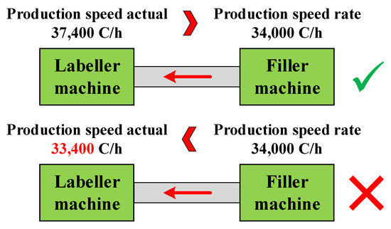 The concept of the fast restart function was developed in the Simatic Manager Step 7 program—a program used in conjunction with the programmable logic controller (PLC). This program is used to process production system operations. The fast restart function is based on the principle of comparing the production speeds between two machines to determine the possibility of continuous operation. As displayed in Figure 10, if the production speed of the filler machine is 34,000 bottles per hour, the labeller machine must ensure production at a speed of more than 34,000 bottles per hour. In the fast restart function, the filler machine can be started by ignoring the signal from the backup sensor. Conversely, if the labeller machine has a production speed same or less than 34,000 bottles per hour, the fast restart function will halt operations immediately. After the fast restart function, all machines will operate at the highest production speed. During the fast restart function, the back-up sensor signal is disregarded to prevent blocking of the restart function. This function will remain in the fast restart function state until the bottle in the conveyor is reduced to a level of back-up sensor 1, then will go into normal working condition. Then the working speed of the labeller machine, variopac machine, and palletizer machine is proportional to the number of bottles accumulated in the belt. These are described in Section 3.2 and Table 2 by slow speed sensor, medium speed sensor, and fast speed sensor of the machinery in the conveyor.