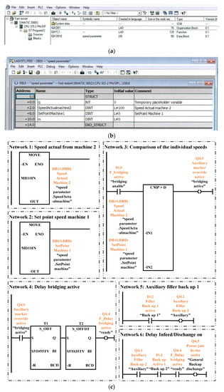 The fast restart function is written in the Simatic Manager Step 7 program as a ladder diagram language including one function block and one data block, as indicated in Figure 11a. The function block is used to control the operation of the fast restart function, while the data block collects the machine’s production speed. In Figure 11b, a data block (DB10) consists of a speed actual machine 2 and a set point machine 1. The function block (FC1) consists of six networks, as demonstrated in Figure 11c.