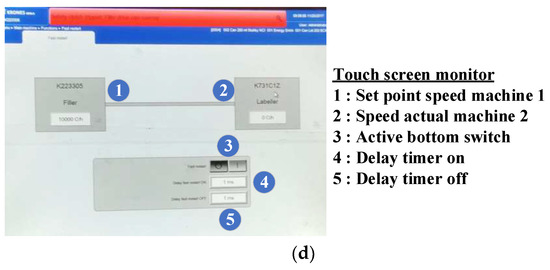 The labeller machine (Number 4 in Figure 1a) is used to label each product’s trademark. The labeller machine sequentially conveys individual bottles via the conveyor into the machine, attaches the label of the product, and passes each bottle through the labelling inspector again to verify the correct labelling.