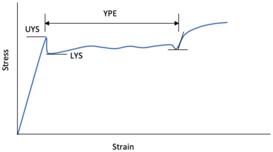 Stress–strain diagram showing Yield Point Elongation (YPE) and Upper (UYS) and Lower (LYS) Yield Strengths [10].