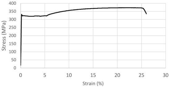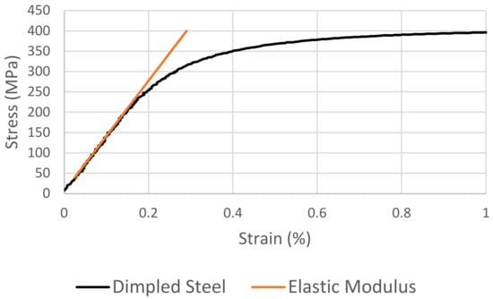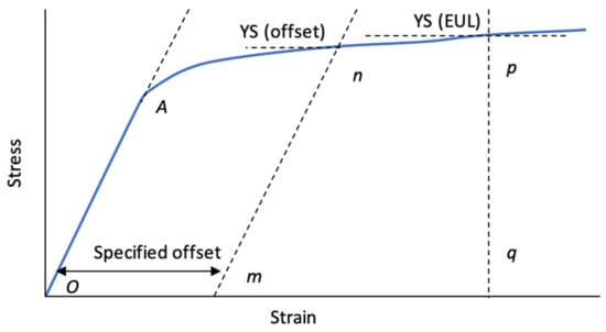 Based on a somewhat arbitrary offset (most commonly 0.2% strain [10,12]) of the line OA in Figure 3, representing the Elastic Modulus, along the strain axis, the σY is measured as the stress where this offset line, mn, intersects the stress–strain curve. This is also considered the default method for the determination of yield strength as is detailed in Note 33 of the ASTM specification [10]. This method, being based on the offset of a line representing the Elastic Modulus, implicitly assumes that this can be reliably used as an analogue to plastic strain. The upshot of this is three limitations to applicability: the stress–strain curve must exhibit a substantial linear elastic region enabling a reliable measurement of the elastic modulus; the elastic behaviour must not change appreciably over the offset range employed; and the microscopic and macroscopic yields must be similar so that the offset line crosses the stress–strain curve where the behaviour is predominantly plastic. It is evident in Figure 4 that stainless steel lattice and porous Ti6Al4V (porosity 7.6%) both exhibit this type of behaviour. Therefore, the yields of these can be accurately characterised by the standard σY. Conversely, Figure 5 illustrates the pre-macroscopic yield departure from linearity that is typical of the tensile load response of dimpled steel and makes the σY inapplicable. Illustrated in Figure 3 as line qp, σEUL is, simply, the stress at a given strain. Applicable primarily in applications requiring allowable strain as opposed to yield stress, this is explored below.