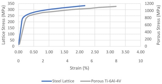 Experimentally measured stress–strain curves for a stainless-steel lattice and porous Ti6AL4V (porosity 7.6%) subjected to tensile loading [13,14] (reconstructed data).