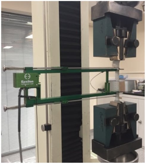 Illustrated in Figure 7, the tests were conducted according to British Standards [12]. Each sample was fixed in aligned grips for tensile testing on a rig with a maximum load capacity of 50 kN (H50KS Tinius Olsen Ltd., Surry, UK). An extensometer of 50 mm gauge length (Epsilon 50 mm extension) was then attached to the specimen to measure uniaxial strain in the loading direction. The plain and dimpled samples were of 0.54 ± 0.03 mm gauge and 1.22 ± 0.02 mm effective gauge, respectively, and were tested to failure at a strain rate of 2.50 mm/min. Effective gauge here refers to the overall thickness of the dimpled samples.