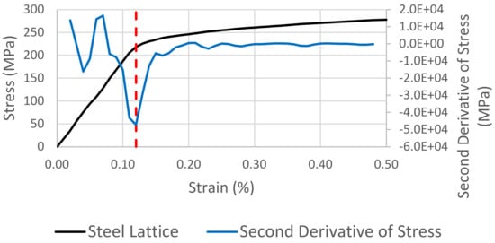 Derivative yield as applied to the experimentally measured stress–strain curve for a steel lattice subjected to tensile loading. The Strain axis to 0.5 enables the best illustration.