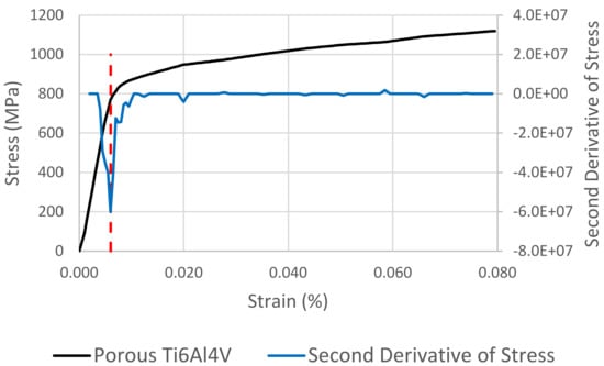 Derivative yield as applied to the experimentally measured stress–strain curve for porous Ti6AL4V (porosity 7.6%) subjected to tensile loading. The Strain axis to 0.5 enables the best illustration.