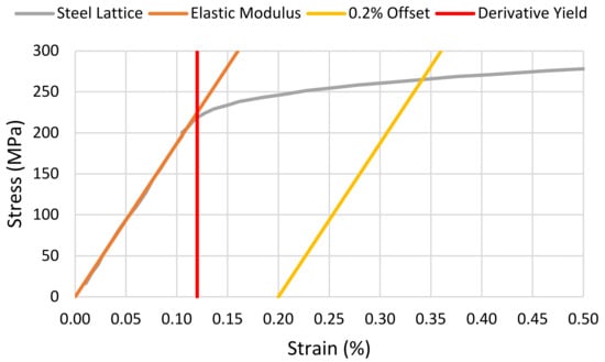 Comparison of the results from the offset yield and the derivative yield as applied to the experimentally measured stress–strain curve for a steel lattice subjected to tensile loading. The Strain axis to 0.5 enables the best illustration.