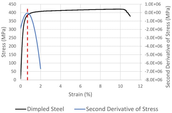 Derivative yield as applied to an experimentally measured stress–strain curve for dimpled steel subjected to tensile loading.