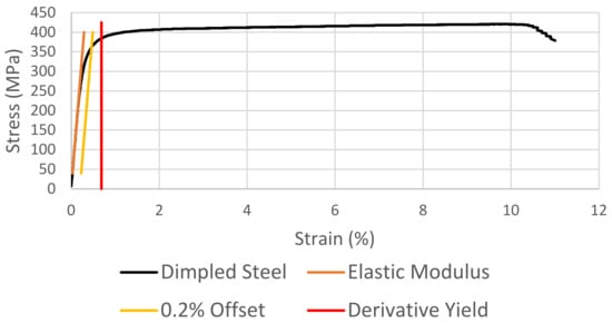 We must consider, then, the severely continuous yielding exhibited by the dimpled steel. As has been discussed, the formulations of the standard methods for the identification of yield strength are not strictly applicable due to the lack of a substantial region of linearity in the stress–strain curve as well as the difference between the microscopic and macroscopic yield behaviours inherent to this type of structure. Firstly, the offset method is inapplicable due to the pre-macroscopic yield departure from linearity in yielding of this nature. However, since this is defined as the default method for the determination of yield strength, it is used here as an indicator of the potential applicability of the alternative standard, σEUL. The average strain at yield as determined by the 0.2% offset method for the present dimpled steel data is 0.4% with a variation of 0.13%. Such a large variation in this measure indicates that the σEUL may also be inappropriate for the quantification of the yield strength in materials exhibiting severely continuous yield, except in applications where the allowable strain under a given load is more pertinent than the yield strength. Applying the σΔY as shown in Figure 13 clearly and non-arbitrarily identifies the point of most pronounced yielding in the dimpled steel. Illustrated in comparison with the σY,0.2 in Figure 14, it is clear that the σΔY method again produces a more representative characterisation of the behaviour of dimpled steel than the standard offset method.