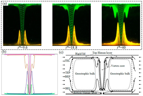 The evolution process of the Ekman layer (t* represents the normalized time). (a) Flow visualizations of steady vortexes. (b) Streamline on meridional r–z planes. (c) Flow pattern sketch. (Reprinted with permission from Ref. [54]. 2013, Cambridge University Press).