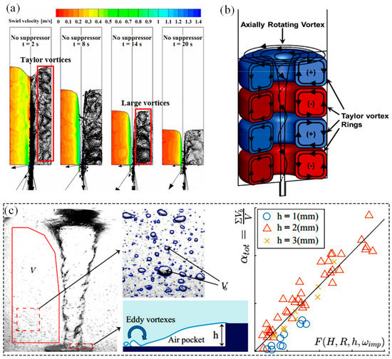 Son [55] investigated the air-core phenomena with a cylindrical tank and explored its formation process. Due to centrifugal instabilities, Taylor vortices developed along the side wall (Figure 3a), progressively increasing their volume in the tank. Park [56] looked at the Taylor and Ekman vortices and how they interact and found that axially spinning-downward flow structures accessed the Taylor-vortex ring (Figure 3b), which demonstrated the effects of Ekman effects on vortex cores. Yokoyama [57] observed that vortexes take on the two cell structures with transport and ascending characteristics. Kim [58] investigated the generating course of gravitational-surface vortexes (Figure 3c) and observed that bubble flows and separating processes of the eddy vortex are affected by the Ekman layer, which illustrates that the Ekman layer appears to impact vortex production considerably.