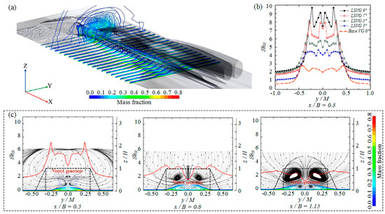 Mass transfer process of the compressible vortex flow field. (a) Species profiles with mass fraction. (b) Mass transfer profiles at x/B = 0.3. (c) Streamlines of species mass fraction. (Reprinted with permission from Ref. [61]. 2017, Elsevier).
