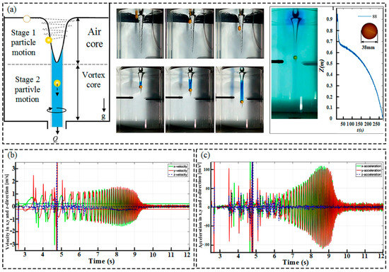 The flow patterns of particles propelled by the gravitational surface vortex were investigated by Duinmeijer [72,73]. The particle was discharged at the tank’s surface, where it was grabbed by the vortex core and moved downhill after rotating (Figure 7a). After 7~8 s, the granule was nearly motionless at the z direction and rotating. When compared to the radial speed (<1.5 m/s), the z-direction velocities (Figure 7b) were significantly low (<0.15 m/s). The particle’s acceleration (Figure 7c) grew progressively after release, and its value reached more than 100 m/s2 and then decreased. Although flow-pattern evolutions of multi-particles in a strong turbulent vortex evolution process have been observed at low Reynolds numbers, the flow pattern evolution of single-particle vortex flow fields has not been observed. As a result, more research into high-precision vortex particle-flow measuring technologies is required.