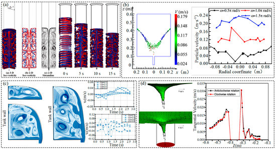 Flow patterns of the surface vortex [66,67,68,75]. (a) Vorticity distribution. (Reprinted with permission from Ref. [68]. 2015, Springer Nature). (b) Particle velocity. (Reprinted with permission from Ref. [75]. 2019, Elsevier). (c) Flow field streamlines. (Reprinted with permission from Ref. [67]. 2018, Springer Nature). (d) Flow patterns with a different rotation. (Reprinted with permission from Ref. [66]. 2020, Springer Nature).