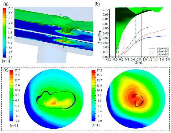 Song [81] studied the formation course of surface vortexes in nuclear power plants (Figure 9a). The development rule of vortex intensity Is = ∫ASdAh was studied, where S was the swirling strength computed via velocities and Ah was the horizontal circular slice. As the radius surpassed 0.0045 m and the dimensionless z/h value was modest, the Is valve grew slowly with radius (Figure 9b). The swirling strength distribution was calculated based on the critical radius above in Figure 9c. It was found that the vortex intensity was centered in the gas–liquid mixed zone encompassed by the blue line and was more robust in the lower position. The mixing zone had a high speed and was affected by the exhaust port’s suction, resulting in the highest vortex strength near the nozzle.