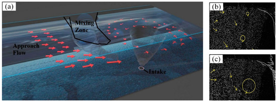 Naderi [82] investigated the influence of the flow structures of the gas-core vortexes and found flow structures of mixing zones due to vortexes and closer flows interacting (Figure 10a). The closer flow approached the vortex and generated turbulence mixed zones before being sucked into the secondary vortex upstream. The partial structure broke down into two small horizontal vortices vortex pairs at t = 4 s (Figure 10b). Then, the vortex pairs joined into the small coherent eddy at t = 8 s (Figure 10c). Decomposition and aggregation of turbulent vortices occurred because the secondary vortex spinning core was erratic, fluctuating in intensity and location. Tan [43] created the PIV experiment platform to explore the vortex suction processes. The vorticity takes on an aggregation tendency around the front end, revealing the vortex potential and kinetic energy transfer process.