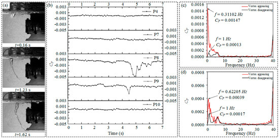 Zhang [89] found the pressure pulsation evolution by experimentally studying the evolving course of roof-attached vortexes, as shown in Figure 11. During the initial state of surface vortexes, pressures sited at P8 and P9 fell; however, the pressures of monitoring points (P4, P7, and P10) had no considerable variation. A surface vortex was more common at the P8 and P9 points. The frequency and pressure-pulsation coefficient Cp value of the vortex was not significantly different from the no-vortex situation. The typical frequencies were 0.31102 Hz and 0.62205 Hz, respectively.