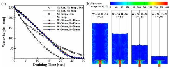Son [68] suggested a simple and effective disc-type eddy current suppressor. The tank was emptied in 21 s with no suppressor and no tank rotation, as illustrated in Figure 12a. However, there was no dramatic shift in outlet flow in the suppressor case. Compared to a rotational tank without a suppressor, the time required for complete draining was reduced. In Figure 12b, the disk-type suppressor efficiently suppresses axial flow growth and vortex formation in the tank’s center, and vorticity does not spread toward the center using suppressors. The developed disc damper efficiently restricted axial-momentum transmission at the vessel and effectively inhibited the Taylor vortex’s expansion.