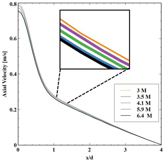 Three fields in the round jet can be defined as the near, intermediate, and far fields. Researchers have focused on turbulence around free jets, and they have studied the far-field areas and the near field of the potential core. Theory, experiments, and/or modelling and experiment were the three investigations used in the previous studies [,,,,,,,,,]. Moreover, numerous studies have been conducted over the last decade focusing on the flow behavior at different conditions in the scaled models for the lower and upper plenum of the HTGR [,,,,]. Several researchers have studied nuclear reactors to examine the behavior of single and multiple jets flows in scaled-down HTGR facilities using CFD models [,,,,,].