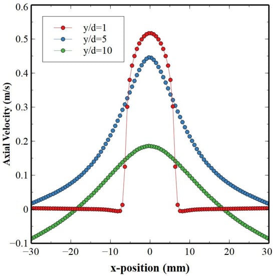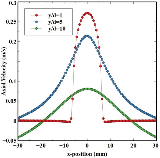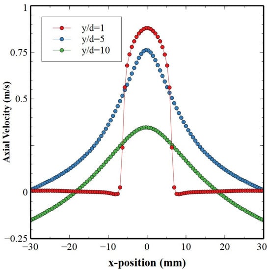 The results of the current study are divided into two sections. The isothermal and non-isothermal single-jet models were investigated in the first and second sections of the study, respectively. In the first section, three different single-jet simulations were modeled for given operating conditions, as shown in Figure 2. In addition, ANSYS Fluent was performed and analyzed for other Reynolds numbers from 3413–12,819. The selected Reynolds numbers were based on the operating conditions of the HTGR for the scenario of coolant accident loss. Furthermore, three various axial locations were investigated using ANSYS fluent, as shown in Figure 5 (y/d = 1, 5, and 10).