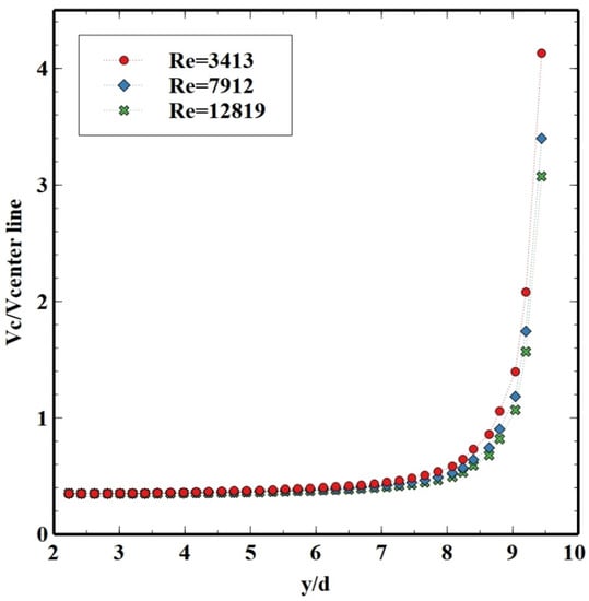 Figure 9 shows the localized velocity decay rates for different Re numbers along the jet centerline. The results showed high fluctuations of the velocity decay profiles inside the jet-flow axial height. Further downstream, Re = 7912 and Re = 12,819 merge into one profile with similar decay rates. From the nozzle exit of y/D = 9.2, there was an exponential increase in the decay profile due to jet impingement on the upper plenum, thus resulting in reduced centerline velocity, which made the decay profiles increase.