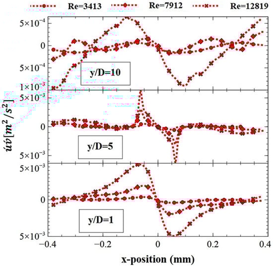 Reynolds stress across x-position at various axial locations for Re = 3413, Re = 7912, and Re = 12,819.