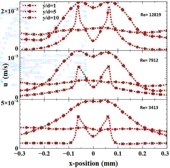 Figure 11 shows the results of the radial velocity () along different axial locations. The  has nearly the same shape and peaks similar to the ones near the upper plenum inlet y/D = 1. These peaks were mainly located over shear layers where jet momentum was exchanged with the surrounding fluid. At y/D = 10, the turbulence intensities were anisotropic due to turbulence structure influences [].