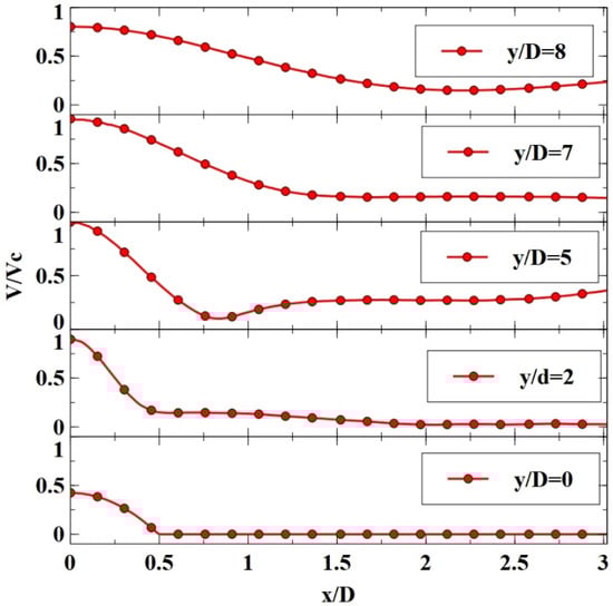 It is important to group various types of intrusion according to how they inject into the ambient fluid, either momentum, buoyancy, or both. These flows can be classified as partly turbulent as they cause higher turbulence levels in their intrusion vicinity than the surrounding fluid. When incoming fluid is mixed with its dormant fluid body, significant turbulence is created due to the velocity shear. However, when the incoming jet is mixed with the fluid body at rest, the momentum source is caused by the jet itself. Such momentum will remain unchanged along the downstream provided that external forces accelerating or decelerating are either minimal or nonexistent in the jet region []. The ANSYS Fluent results for a single-jet mixing in the upper plenum for different axial mean velocities against Reynolds numbers are presented in Figure 6, Figure 7 and Figure 8. The results show that the maximum values for jet velocity are attained at the y/D = 1, followed by a steady decrease downstream with expansion in the transverse direction due to the diagonal movement of the jet. The jet flow showed a higher momentum flux at a higher Re number of 12,819, causing large penetration depths compared to lower Re numbers.