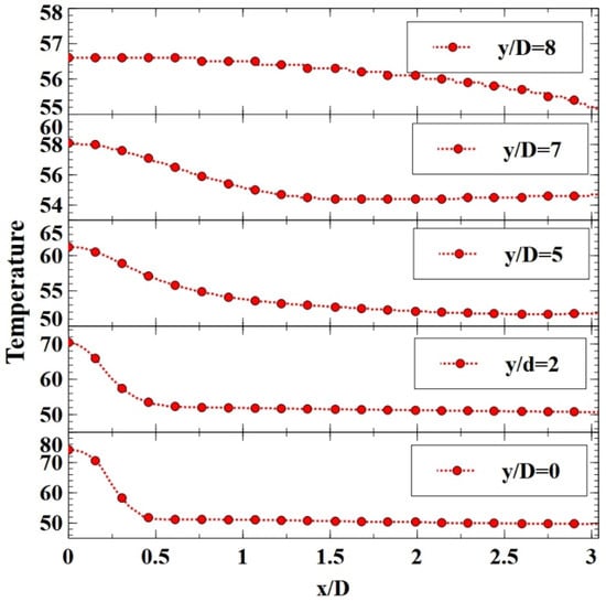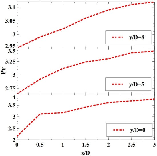 The temperature profiles from y/D = 0 to 8 were interpolated horizontally and plotted in Figure 16, which shows the mean temperature profiles for upper plenum plume mixing. The maximum temperature for the profile from y/D = 0 to 5 at the center of the core inlet shows a similar quick drop in temperature at the end of the core. However, there was a gradual drop in temperature from y/D = 2 to 7. The profiles at y/D = 8 show a decrease in a non-monotonic temperature pattern that could be assigned to the high-temperature flow from the upper plenum wall. On the other hand, Figure 17 shows the effects of the temperature profile on the Prandtl number (Pr). The Pr number increases as the fluid temperature is decreasing. Moreover, increasing the Pr number reduces the thermal boundary layer thickness.