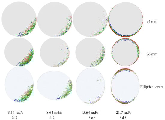 Simulations were carried out in an elliptical drum and two circular drums. The major axis of the elliptical drum is D1 = 94 mm and the minor axis is D2 = 76 mm. The diameter of the circular drums is D1 = 94 mm, which is the same as the major axis of the elliptical drum. The diameter of another circular drum is D2 = 76 mm, which equals the minor axis of the elliptical drum, as illustrated in Figure 1a. The width of all three drums is 8 mm. There are two types of particles in the drum, the red particles with 1 mm diameter were at the bottom of the rotating drums and the blue ones with 3 mm diameter were located in the upper layer. As shown in Figure 1b–d, two layers were observed in the initial state of binary particles in the rotating drums; ω is the rotational speed of the rotating drums.