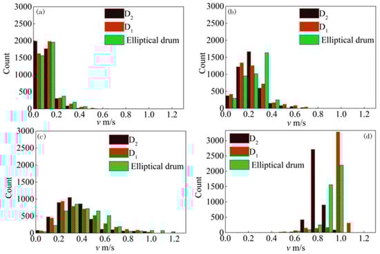 In the 3.14 rad/s case (see Figure 6a), the majority range of the particle velocities is from 0 m/s to 0.2 m/s; the maximum count is close to 2000. The magnitude of the particle velocity varies in the widest range for the rotational speed 15.64 rad/s, from 0 m/s to 1.3 m/s, as shown in Figure 6c. The number of the counts is similar for three rotating drums. Figure 6d shows the particle velocity of the centrifuging regime is 0.8 m/s. The number of particles in the D2 drum is 2700, the velocity of which is about 0.75 m/s; there are above 3000 in the D1 drum, of which the velocity is about 1 m/s. However, the count is rising gradually from 0.8 to 1.0 m/s for the elliptical drum and the maximum count is lower than for the circular drums.