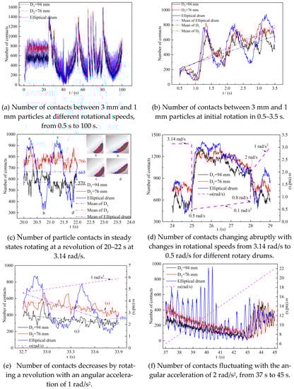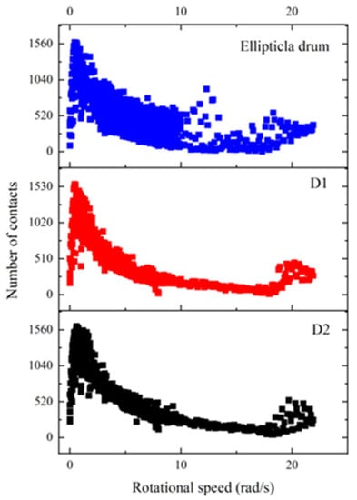 Figure 9f shows that for the high rotating speed with 2 rad/s2 rotational acceleration, the number of contacts changes from 37 s to 45 s, and the flow regimes transfer from cataracting to centrifuging. The number of contacts dropped slightly, followed by increasing the rotational speed. At 42.5 s, the flow regime of the drums was centrifuging; at the same time, the number of contacts of the two circular drums are close to one another. A steady increase in the number of contacts, developed in parallel with the centrifuging. The number of contacts changes for the elliptical drum was more complicated than for the circular drums, the number of contacts of the elliptical drum slow down, then, the maximum is larger than D2′s, and the rotational speed of the drum is from 6 rad/s to 11 rad/s. As the rotational speed continues to rise to 13 rad/s, the maximum number of contacts has greater growth than at 11 rad/s. Due to the continuous changing of the major and minor axes of the elliptical drum, a quarter of the elliptical arc plays a key role in carrying particles and scattering the particles within the elliptical drum. The cataracting flow regime of the elliptical drum is better manifested than for the circular drums, as shown in Figure 3c.