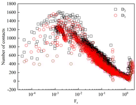 However, the major and minor axes of the elliptical drum alternate changes, and the Fr is not constant in a period of rotation. Furthermore, the number of contacts of two circular drums is related to Fr, as shown in Figure 10. As the maximum value of the number of contacts is above 1600, Fr is about 10−3, accordingly, and the regions conform to the rolling regime, the simulation results are the same as 8. The number of contacts reduces gradually as Fr increases, the minimum value of the number of contacts is correspondingly around zero, and Fr is about 1.3. After that, the number of contacts increases with the growth of Fr. On the whole, the number of contacts of D2 drums is larger than that of D1.