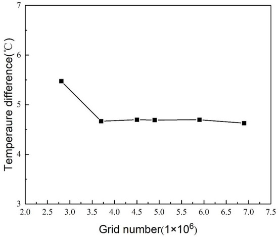 To ensure the reliability of the final results, a grid independence study is conducted. The maximum temperature differences of the battery pack predicted by different grids with different grid numbers are compared in Figure 3. When the number of grids increases from 4,502,617 to 6,916,726, the difference is only 0.05%. Therefore, the grid number of 4,502,617 is selected for the following numerical study to obtain accurate results.