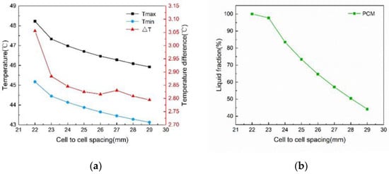 (a) Tmax, Tmin, and ∆T at 1800 s for different cell spacings. (b) PCM liquid fraction at 1800 s for different cell spacings.