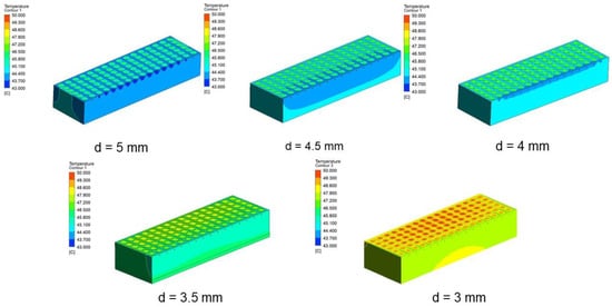 The distance (d) from the battery to the cooling plate is another key geometric element. The closer the battery is to the tube in the cooling plate, the greater the influence of the cooling tube on the cell temperature and the better the cooling effect. This also determines the length of the entire battery pack and the volume of the PCM. Therefore, choosing a suitable distance from the battery to the cooling plate is necessary for practical applications and economy. In this section, the distance between the battery and the center of the cooling plate is set to 3, 3.5, 4, 4.5, and 5 mm, and the inlet mass flow rate is fixed as 1 × 10−4 kg/s. The distance between batteries is 23 mm. Figure 6 illustrates the battery pack temperature contour for different cell-to-cooling-plate distances at the end of the 2C discharge (1800 s). Obviously, from d = 3 mm to d = 5 mm, the temperature distribution of the battery pack and PCM is significantly improved. Figure 7a shows the maximum temperature difference, the maximum temperature and the minimum temperature after the 2C discharge of battery packs with different cell-to-cold plate distances. When the distance changes from d = 3 mm to d = 3.5 mm, the maximum temperature of the battery pack drops from 49.97 °C to 48.22 °C. The cooling effect of the battery pack is significantly improved. When the distance changes from d = 3.5 mm to d = 5 mm, the improvement of battery thermal performance gradually reduces. It can be noticed that the maximum temperature difference of the battery pack increases as the distance from the battery to the cold plate increases. As the thickness of the PCM between the battery and the cold plate increases, the leading role of water in the process decreases. The speed at which the cooling plate takes away heat decreases, and the temperature difference rises slightly. Overall, the shorter the distance between the battery and the cooling plate, the better the cooling capability of liquid cooling.