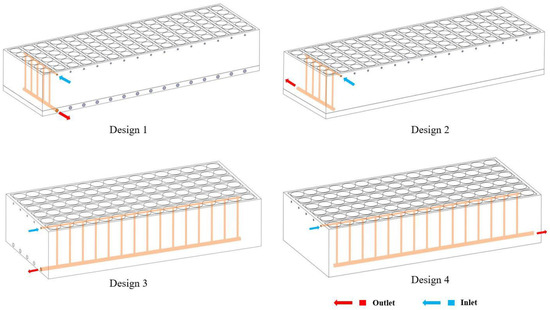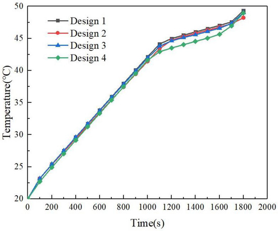 The ideal locations of the inlet and outlet portions of the microchannels are determined through the selection of four arrangements of the cold plate (Figure 8). Under the battery spacing of 23 mm and the distance between the battery and the cold plate of 3.5 mm, the maximum temperature evolution of the battery pack under the four cold plate flow channel arrangements at a constant discharge rate of 2C is shown in Figure 9. Design 2 shows the best performance, with the maximum temperature reduced by 1.11 °C, 0.8 °C and 0.7 °C compared to designs 1, 3 and 4, respectively (Table 3). Judging from the slope of the curve, design 2 is the last to start the phase transition in all the arrangements. If the phase change material prematurely and completely melts out, then the large heat storage capacity will disappear, which is not good for thermal diffusion. Among all the arrangements, the maximum temperature difference between design 3 and design 4 is the worst, close to the critical temperature difference of 5 °C. This may be due to: (a) a longer flow path; (b) a poor flow distribution along the center channel of the cold plate. Therefore, only design 1 and design 2 remain as choices. It can be noticed that the pressure drop of design 1 (ΔP = 51.77 Pa) is the highest among the four layouts, which is about five times the pressure drop of design 2 (ΔP = 10.33 Pa). So, design 2 is selected for further research.