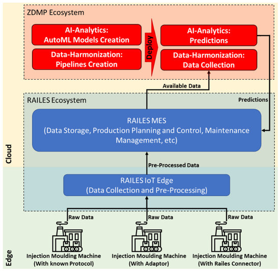 As can be observed, the system consists of three large groups. The shop floor where machines operate and where changes and improvements are needed. The RAILES ecosystem is responsible for data extraction and all production management through the MES. Furthermore, the ZDMP ecosystem will be integrated to extend what is offered by RAILES. All raw data generated by the machines and the process are sent to the RAILES IoT Edge. For a device to send this raw data, it must have an integrated RAILES IoT Connector, an adaptor or the capacity to send the data in a protocol known as the RAILES IoT Edge. When the RAILES IoT Edge receives the data, it makes a preliminary analysis so that these data can later be used. This layer is composed of a device or network of devices responsible for giving context to the data, completing the collected data and so forth. When the data are pre-processed, they are sent to the cloud, where the RAILES cloud environment will store these data in a PostgreSQL database and make it available for the most advanced features of MES RAILES. At this level, the system is already capable of planning and controlling production, monitoring the system and managing maintenance tasks. Within the ZDMP ecosystem, two large groups constitute the two different phases of platform execution. In the initial phase, during the development and setup of the platform, the design versions of the two used components will be used. The Data Harmonization component will be used during the design phase to create the pipelines that will allow data extraction. Regarding the AI-Analytics component, it will be used to develop the classification models, which will be able to generate some preliminary and more generic forecasts for the injection molding process. During the runtime phase, that is, during production, the Data Harmonization component will be responsible for receiving the data made available by the RAILES ecosystem. The AI-Analytics component will use these data to generate predictions based on the models created in the design phase. The predictions generated by the ZDMP ecosystem (AI-Analytics) are then sent and made available to the RAILES ecosystem. Hence, these predictions can be used to reduce problems related to quality through alerts, changes to production planning and changes to the maintenance schedule, among other things.