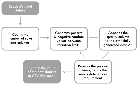 For this paper, the Data Augmentation was implemented using python language software. As can be observed in Figure 5, the original dataset is imported to the program in CSV format. This dataset serves as the basis of information for synthetic data generation. The algorithm counts the rows and columns of the dataset and registers the values of each variable. Then, it multiplies the feature by a pseudo-random number with defined limits. The boundaries are defined to apply slight variations to the magnitude of the original process with a focus on maintaining the organic characteristics.
