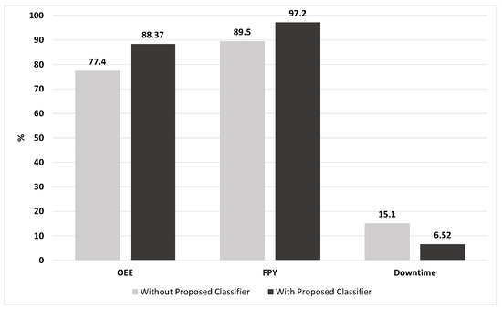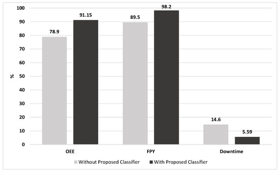 This machine has a production cycle that lasts for 77.1 s, has only one cavity and works five days a week, totaling 5603 parts produced each week. Without any classifier, this process had an OEE of 77.4%, a downtime of 15.1%, an FPY of 89.5% and a total of 588 defective products. Of all these 588 defective products, 120 are inherent to the process, such as machine cleaning stops, which leaves us 468 failures to act on. As the accuracy of the classifier is approximately 92%, about 37 of these 468 failures will not be predicted correctly, leaving us with a total of 431 failures that can be prevented. It is possible to observe the results of introducing the classifier in the process in Figure 8.