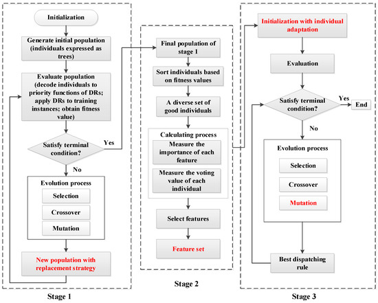 The existing literature on feature selection methods for DJSS generally employs an offline selection mechanism. The overall process is usually divided into two parts, in which feature selection is taken as a preprocessing step to obtain the feature set first. Then the selected features are used in another independent GP run to solve the DJSS problem. The whole process is completed independently and separately, which is time-consuming and impractical. In order to evolve high-quality rules with compact structures effectively, this paper proposes a novel GP algorithm with online feature selection based on the idea in Zhang’s research [20]. As illustrated in Figure 2, the framework of the proposed approach comprises of three steps. In the first stage, the GP proceeds with a diversity management strategy that considers the stopping criterion and elapsed period to obtain a diverse set of superior individuals for feature selection. An essential feature of this diversity management strategy is the dynamic penalization scheme that considers similarity measures between individuals in the replacement phase. This way, a diverse set of best dispatching rules can be derived, which is a key factor in achieving high accuracy in feature selection [19]. In the second stage, the feature selection mechanism is carried out to obtain feature subsets based on the final population obtained in the first phase for the different scenarios. Based on the final population with individual adaptation and selected feature subsets getting from previous steps, stage three is used to evolve more compact and high-quality rules. In the third stage, the standard GP algorithm is used, except for the initialization and mutation process. The initialization process takes the final population of stage 1 as the initial population. The standard subtree mutation is applied by generating random trees using only the selected features.