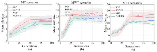 Evolving compact and easily interpretable dispatching rules is important in scheduling tasks. An important factor that concerns interpretability is the rule size, which is usually defined as the number of nodes included in a rule. The concise dispatching rules provide an advantage in reduced computational complexity and increased generalization. Figure 4a–c show the change in average rule size over generations under the MT, MWT, and MFT, respectively. It shows that the SGP tends to evolve much larger rules in all considered objectives compared to other algorithms. These results are in agreement with previous research, which has shown that the rules designed by simple GP algorithms are generally larger. Although the feature selection mechanism is used to eliminate the redundant features in SGP-FS, the average rule size is still larger than NGP and NGP-FS in the three objectives. The second-lowest average rule size is found in the NGP algorithm, demonstrating that dynamic management of diversity in GP positively affects rule size. After the feature selection process (after the 50 generations), it turns out that the evolved rules of NGP-FS become more compact than the NGP algorithm. It is suggested that the NGP-FS algorithm can achieve small feature subsets and simultaneously generate compact dispatching rules.