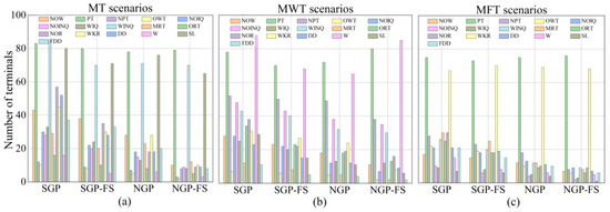 Terminal distribution in the 30 best-evolved rules for the SGP, SGP-FS, NGP, and NGP-FS algorithms for the three objectives. (a): Terminal distribution for the MT scenarios, (b): Terminal distribution for the MWT scenarios, and (c): Terminal distribution for the MFT scenarios.