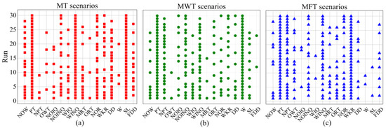 Figure 7a–c exhibit the feature selection results of the NGP-FS algorithm in 30 independent runs for the MT, MWT, and MFT objectives, respectively. Each matrix’s row denotes a run, whereas each column denotes a feature. (Table 2 for details). If a feature is chosen in the th run, a point is drawn at the location where the feature and th run coincide. For the MT objective results depicted in Figure 7a, PT, WINQ, and SL are selected in all 30 runs. It is consistent with the results of previous research [35,37] that PT, WINQ, and SL are the most significant terminals to minimize the mean tardiness. In most runs, NOR, DD, NOW, and WKR features are selected. This means that the jobs with tight due dates and less remaining workload are selected. This means that the jobs with tight due dates and less remaining workload are preferred to be processed in order to reduce the mean tardiness in the job shop. The features ORT, OWT, NPT, and W are not chosen in most runs, which indicates that they may be irrelevant for the MT objective.