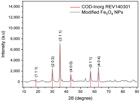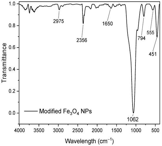 3.3.2. Characterization of Modified Fe3O4 NPs