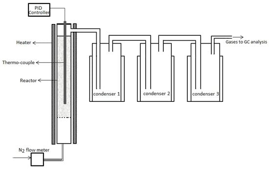 The experiments were conducted in fixed-bed reactor under inert environment. The primary reactor consisted of a cylindrical quartz column with an internal diameter of 75 mm and a height of 420 mm. The preheating of the feed gas was made possible by the heating zone’s proximity to the inlet. The samples used in all of the studies weighed around 50 g. Initially, the reactor was purged with inert gas, i.e., nitrogen, at a flow rate of 500 mL min−1. The ideal heating rate for all tests was 10 °C min−1 from room temperature to the desired temperature, and the desired temperature was maintained for 60 min to ensure reaction completion. Three bottle-jacketed water-cooling condenser units, each with a 500 cc capacity, condensed the volatiles released during the pyrolysis process from the plastic waste into liquid form. The bottle condensers were held at a temperature of 6 °C and connected in series. Non-condensable gases leave the system by the available vent, are collected in the bladder, and undergo qualitative analysis thereafter. Each feedstock was pyrolyzed at 473 K to 973 K to optimize the best yield of liquid, solid, and gaseous products. After the completion of the experiment, residue and condensed liquid was measured, and the yields in weight percentage were calculated. Each experiment was repeated twice, and average values are shown in the manuscript. The methodology adopted in this investigation is shown in Figure 1.