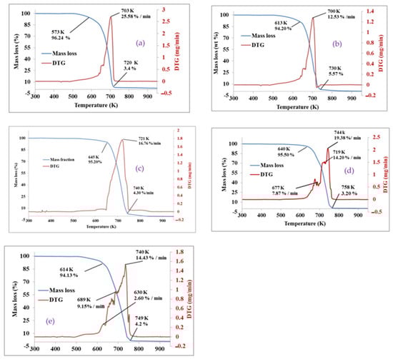 TGA is a standard technique that demonstrates the sample’s behavior concerning time, temperature, and heating rate and helps to get the optimum temperature range for plastic polymer degradation. The TGA analysis curve of domestic plastic waste and virgin plastics under a non-isothermal (10 K/min) range is represented in Figure 2 and the results revealed that the thermal decomposition of LDPE, HDPE, and PP plastic was almost similar. The decomposition of LDPE started at 573 K with an initial mass of 96.24 wt.% and reached up to mass-loss of 3.4 wt.% at 720 K while the degradation of HDPE started with a mass-loss of 94.20% at 613 K and achieved up to 6.57% at 749 K (Figure 2b). Because HDPE has more branching hydrocarbon bonds than LDPE, which indicates stronger internal molecular forces, its degradation range was marginally larger than LDPE’s. As a result, it needed a higher temperature to degrade [4]. On the other side, PP started to degrade at 648 K with an initial mass of 95.2 wt.% and reached a maximum of 2.6 wt.% at 750 K (Figure 2c), indicating single-step degradation. The presence of a single DTG peak also supports the fact that the degradation of all these three plastic feedstocks, i.e., LDPE, HDPE, and PP, takes place in a single step.