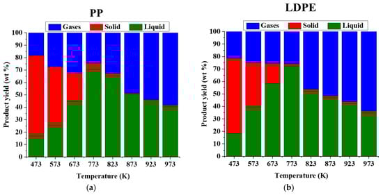 The product distribution of pyrolysis reaction with domestic plastic waste, PP, LDPE, HDPE, and mixed virgin plastic is depicted in Figure 4 and Figure 5. The temperature range for the pyrolysis of these plastics was 573 K to 973 K with a constant heating rate of 10 K min−1. Liquid hydrocarbon fuel, non-condensable gases (pyrolysis gases), and solid residue (pyro char) were the main products of the reaction. The results showed that the yield of gaseous products was increased with the rising of temperature while liquid product yield increased with a specific temperature, and after that, it was found to be decreased with increasing temperature. As shown in Figure 5a, LDPE’s liquid hydrocarbons fuel yield increased from 4.3% (473 K) to 64.6% (773 K) due to the devolatilization reactions being supported by higher temperatures. When the temperature increased beyond 773 K, the liquid product yield was reduced from 64.6% (773 K) to 30.8% (973 K). This may be due to secondary thermal cracking, which results in decomposition of these liquid hydrocarbons into non-condensable hydrocarbons. In addition, higher temperature favors the cracking of the large hydrocarbon molecules into small molecular products [32]. Therefore, the yield of gaseous hydrocarbons was found to be increased with increasing temperature. The poor yield of liquid and gaseous hydrocarbons at lower temperatures was due to incomplete reaction.