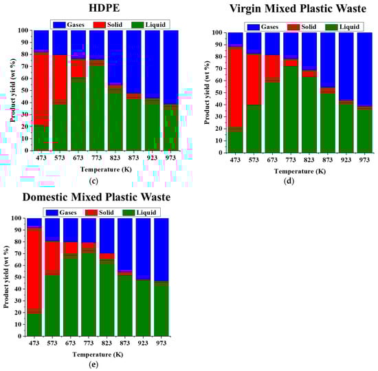 Product yield obtained from pyrolysis of (a) PP, (b) LDPE, (c) HDPE, (d) MVP, (e) DPW.