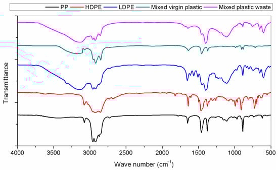 Figure 3 shows FTIR studies of virgin plastics and domestic plastic waste. Large monomers are combined to produce polymer compounds for use in plastics. Some polymers are supported by oxygen doping, whereas others have olefinic composition. However, domestic plastic waste contains fillers, binders, and additives that FTIR spectra can identify regarding the hydrocarbon composition’s stretching frequencies. Figure 3 shows that =C−H, −C−H, and C−C stretching frequencies ranged between 2900 and 3000 cm−1, which indicates the existence of hydrocarbon groups like alkanes, alkenes, and alkynes. Long-chain, closely packed hydrocarbons, and closed, densely packed hydrocarbon molecules are responsible for the behavior. Above 3000 cm−1, wave numbers are slightly skewed. Domestic plastic waste also contains groups that contain oxygen at frequencies between 2600 and 2900 cm−1. The comprehensive summary of the FTIR analysis of domestic plastic waste and mixed virgin plastic are shown in Table 2. Table 2 provides comprehensive details regarding the various functional groups of hydrocarbons and their behavior, strength, and mode of vibration.
